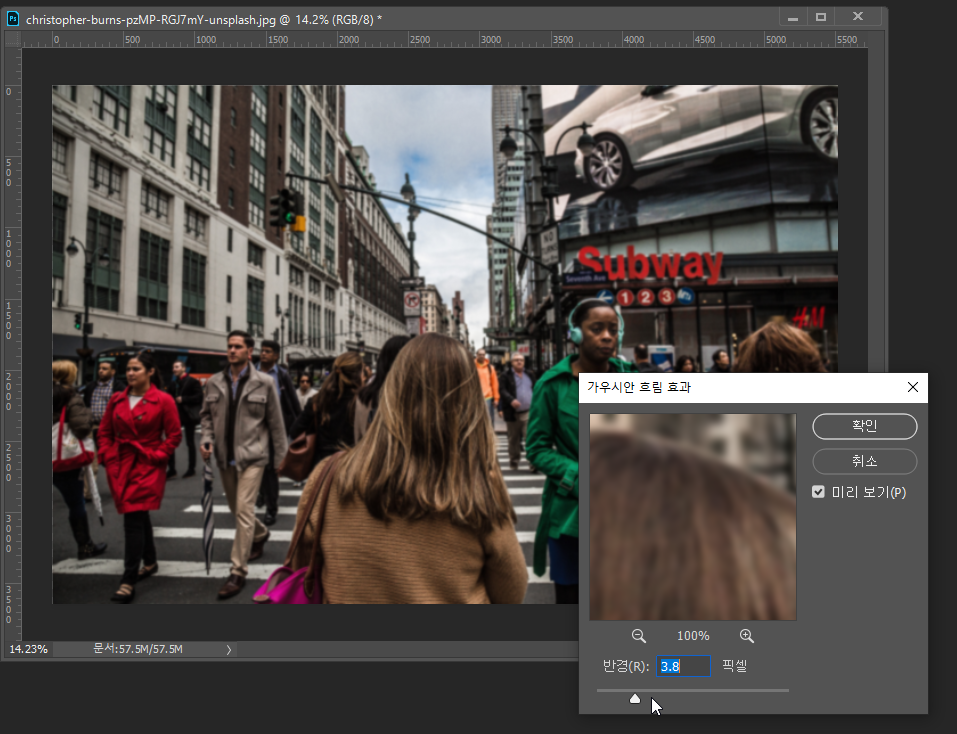 2. 가우시안 흐림 효과 창이 뜨면 '반경 픽셀'을 조절한 후 확인을 누릅니다.