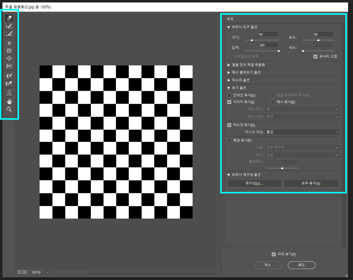 왼쪽 박스 세 번째에 위치한 매끄럽게 도구는 이미 왜곡된 픽셀을 매끄럽게 만들어주는 기능입니다.