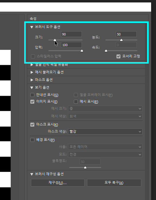 박스 가장 첫 번째 위치한 도구로 드래그하면 픽셀을 앞쪽으로 밀어주는 기능을 가지고 있습니다. 브러시 도구 옵션을 통해 크기 등을 조절할 수 있습니다. 모서리 고정을 체크해놓으면 이미지의 모서리는 고정되어 움직이지 않습니다. 필요한 작업 형태에 따라 모서리 고정을 체크 또는 해제해주세요.